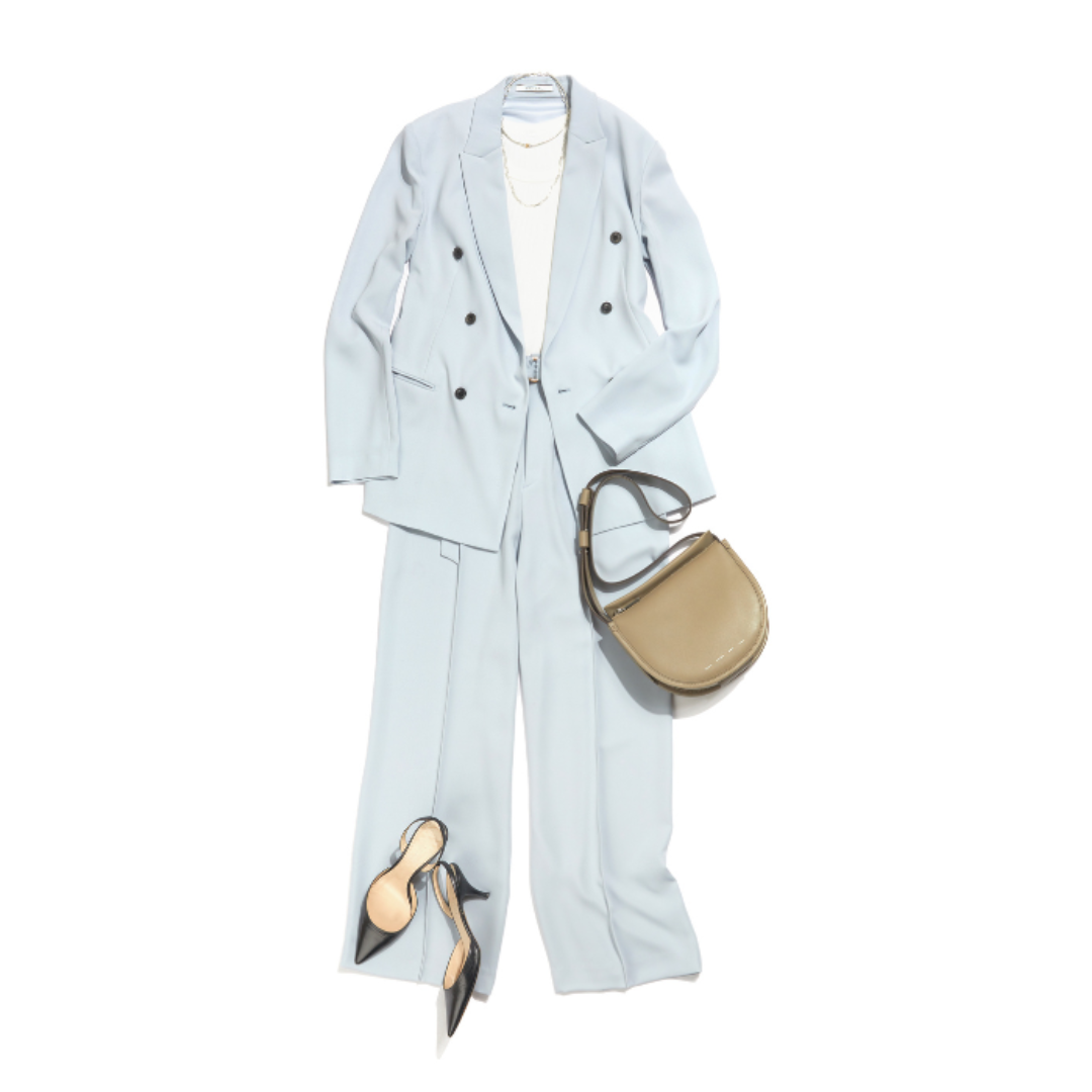 真夏のジャケットスタイルは、清涼感たっぷりなアイスブルーで軽やかに。ベイジ,(BEIGE,)のセットアップは、後ろ身頃にシースルー素材を取り入れたデザインで、見た目も着心地も涼しげ。仕上げにシルバーアクセサリーを添えれば、凛とした通勤コーデが完成します。