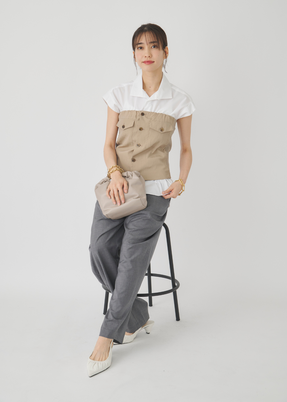 白シャツ×グレーパンツの王道コーデに、2025年夏のトレンドアイテム“ビスチェ”をプラス。シンプルなスタイリングに奥行きが生まれ、きちんと感をキープしながら洒落感を高められます。