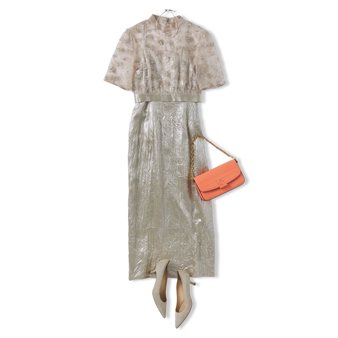 繊細な刺繍レースと光沢感のある生地がひときわ華やかなワンピースは、夏の夜デートにぴったり。360度エレガントなワンピースは、レストランや夜景スポットなど、特別なシーンに映える存在感です。コーラルカラーのバッグを差し色にすれば、大人の可愛げもひとさじプラスして、印象に残るスタイルに。