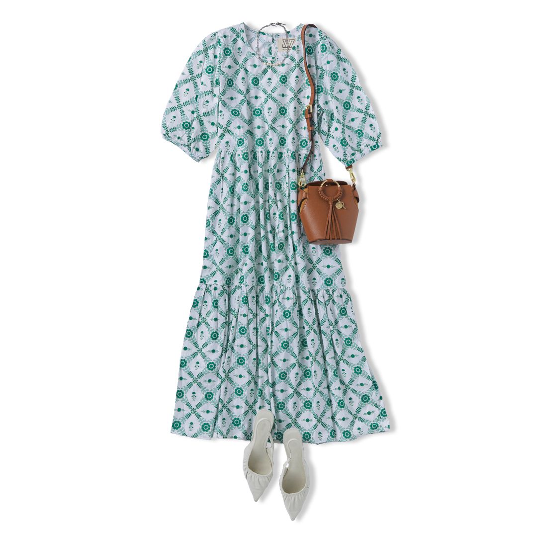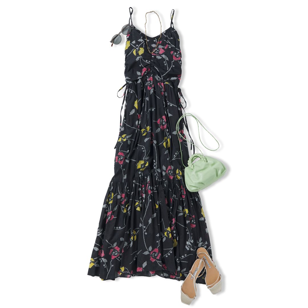繊細なフラワープリントとシアー感が涼しげな印象を与える、上品フェミニンな夏ワンピース。ノースリーブの軽やかさと、やわらかな揺れ感が、歩くたびに絵になる一枚です。グリーンのバッグを差し色にすれば、洗練された大人の可愛さが際立つデートコーデに。