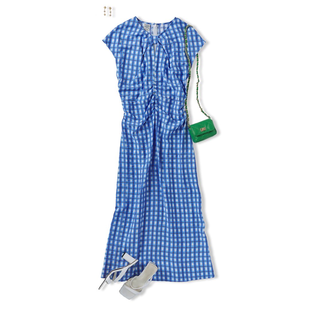 涼やかなブルーチェックが印象的なワンピースは、夏の北海道にぴったりな1枚。やや長めの丈感と軽やかな素材で、街歩きから自然散策まで心地よく過ごせます。白サンダルで抜け感を加えつつ、鮮やかなグリーンバッグを差し色にすれば、旅の写真にも映えるフレッシュな着こなしに。涼しい朝晩にはカーディガンをプラスするのもおすすめです。
