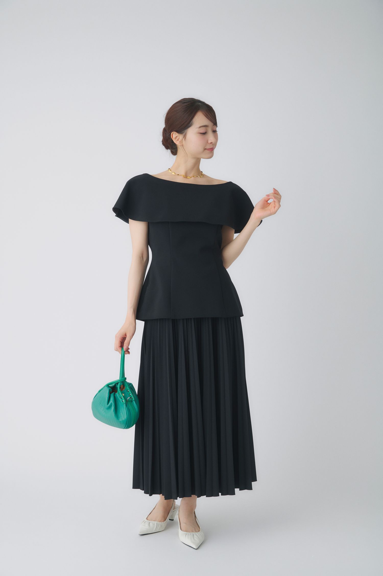 肩周りを華奢に見せてくれる大きめのケープ風デザインがポイントのトップスに、軽やかに揺れるプリーツスカートを合わせた夏の黒コーデ。上半身の立体感とスカートの動きで、全身ブラックでも重たくならず涼やかな印象に。足元は白パンプス、バッグは鮮やかなグリーンを差し色にして、洗練された大人の夏スタイルを楽しんで。