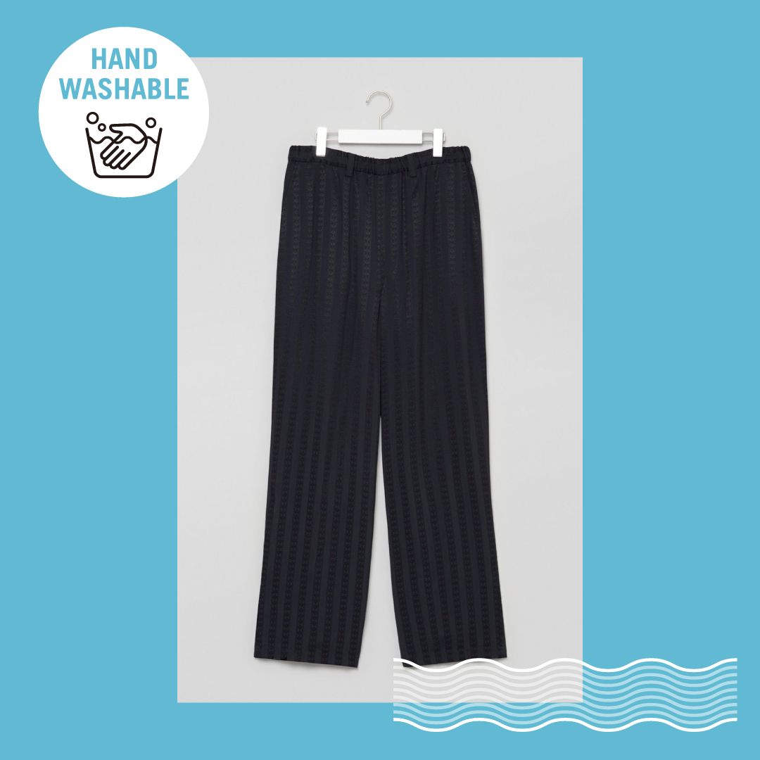 まず初めにご紹介するのは、ニート(NEAT)のスラックス。小さな穴の空いたリップストップに見える生地は、通気性とストレッチ性を兼ね備えており、蒸し暑い日でも快適に過ごせます。ダークネイビーで落ち着いた色味なので、トップスを選ばないのもうれしいポイント。軽量でシワにもなりにくいので、日常履きはもちろんですが、ちょっとした旅行などにも重宝すること間違いなしです。
