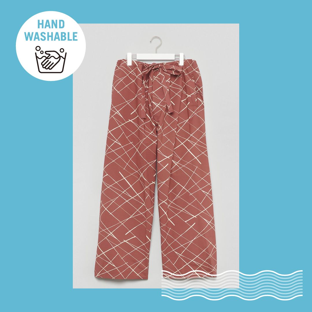 気分が上がらない日は、思い切って明るめな柄パンツを選んでみるのもおすすめです。トゥモローランド(TOMORROWLAND)のイージーパンツは、ベースが赤で不規則な格子状の柄が特徴的。コーディネートに取り入れるだけで、パッと華やぎを添えてくれます。ウエストはゴムでワイドシルエットなので、履き心地も快適です。
