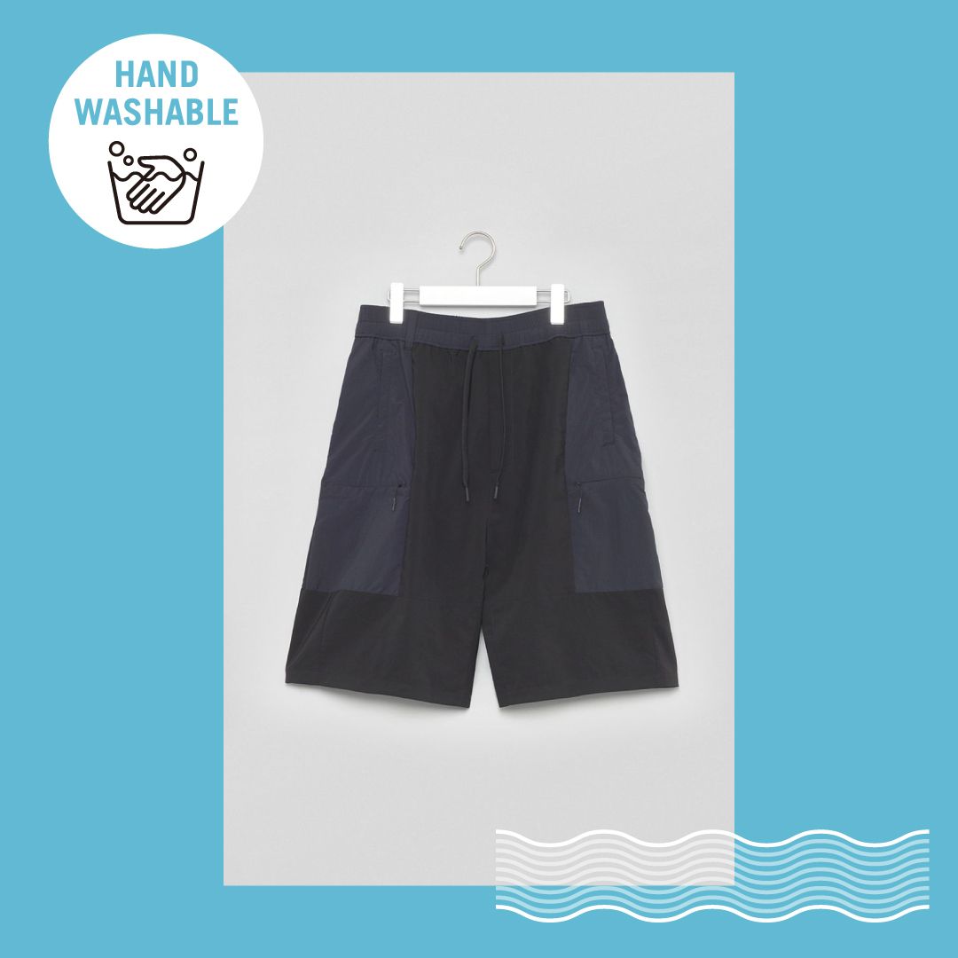 ビーエルケーホワイトマウンテニアリング(BLK White Mountaineering)のハーフパンツは、深い股上のサルエル仕様。ひざが隠れる長さなので、ハーフパンツが苦手な方にもおすすめです。サイドのネイビーの切り替えがさりげないアクセントに。素材もドライタッチなストレッチ素材を使用しているため、快適な履き心地が叶います。